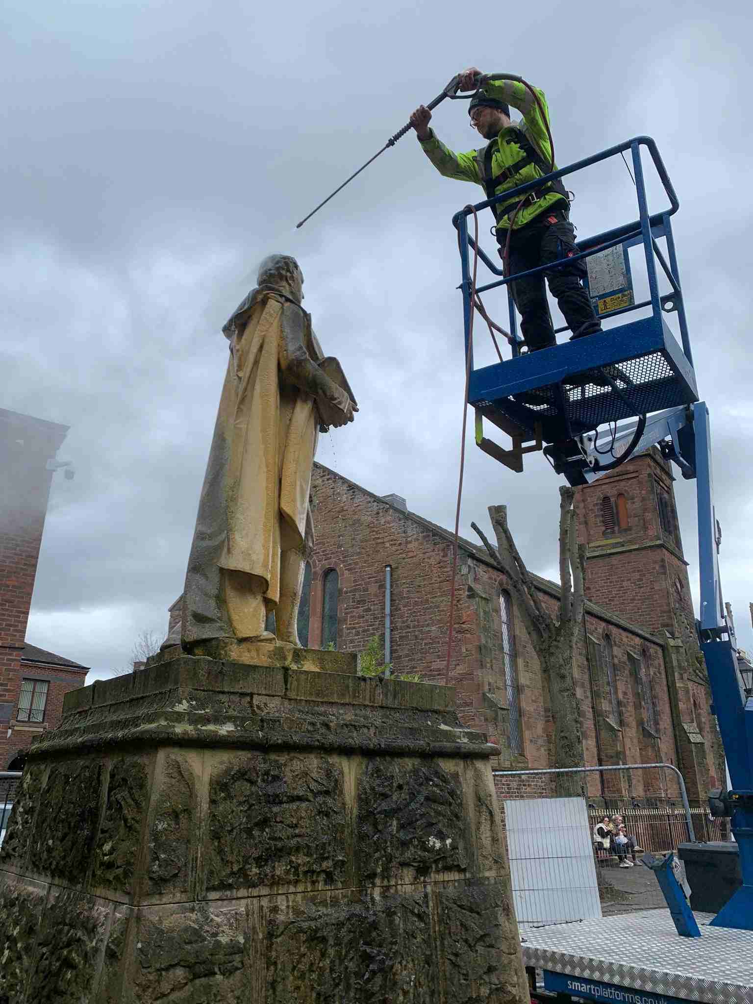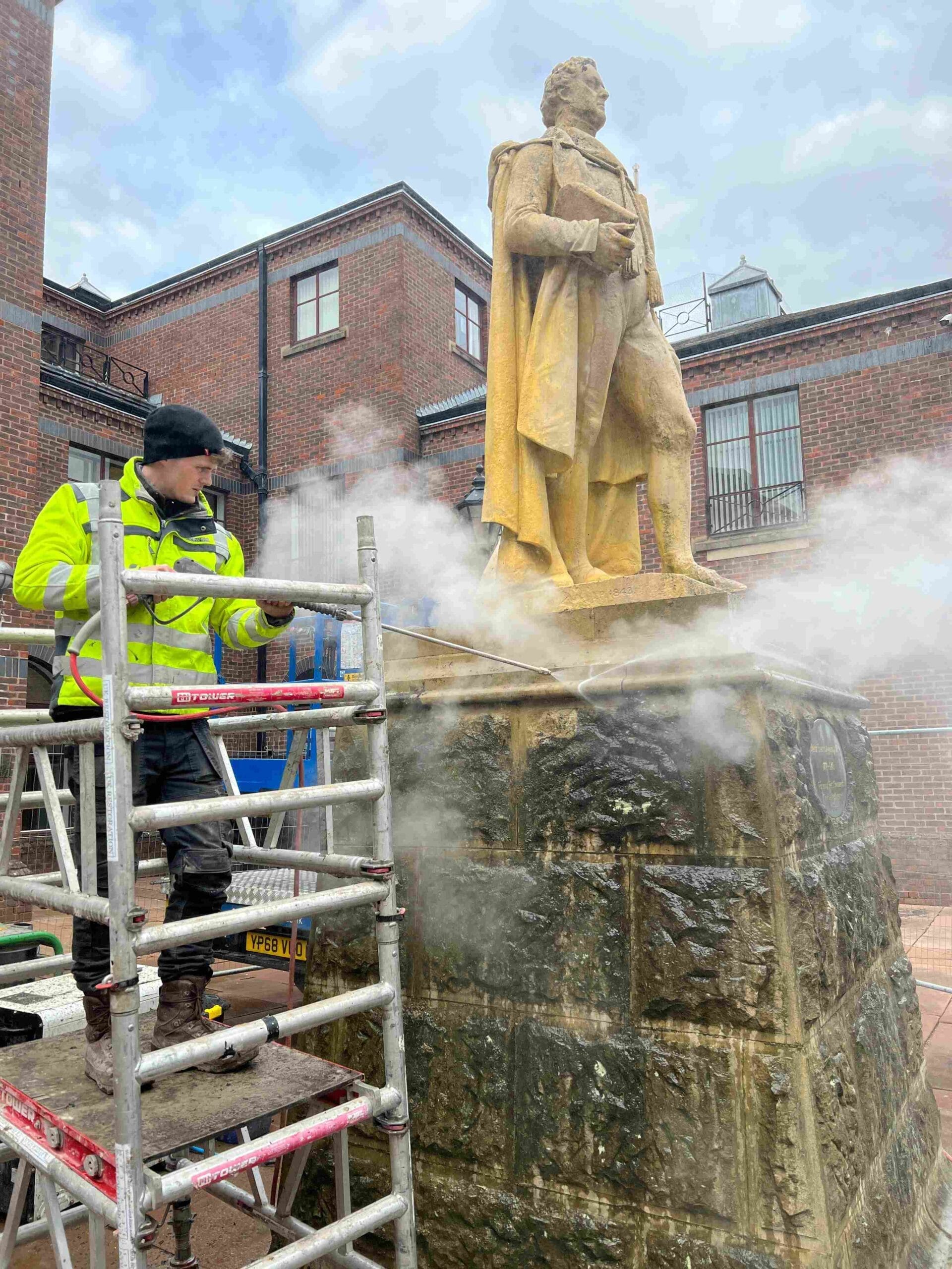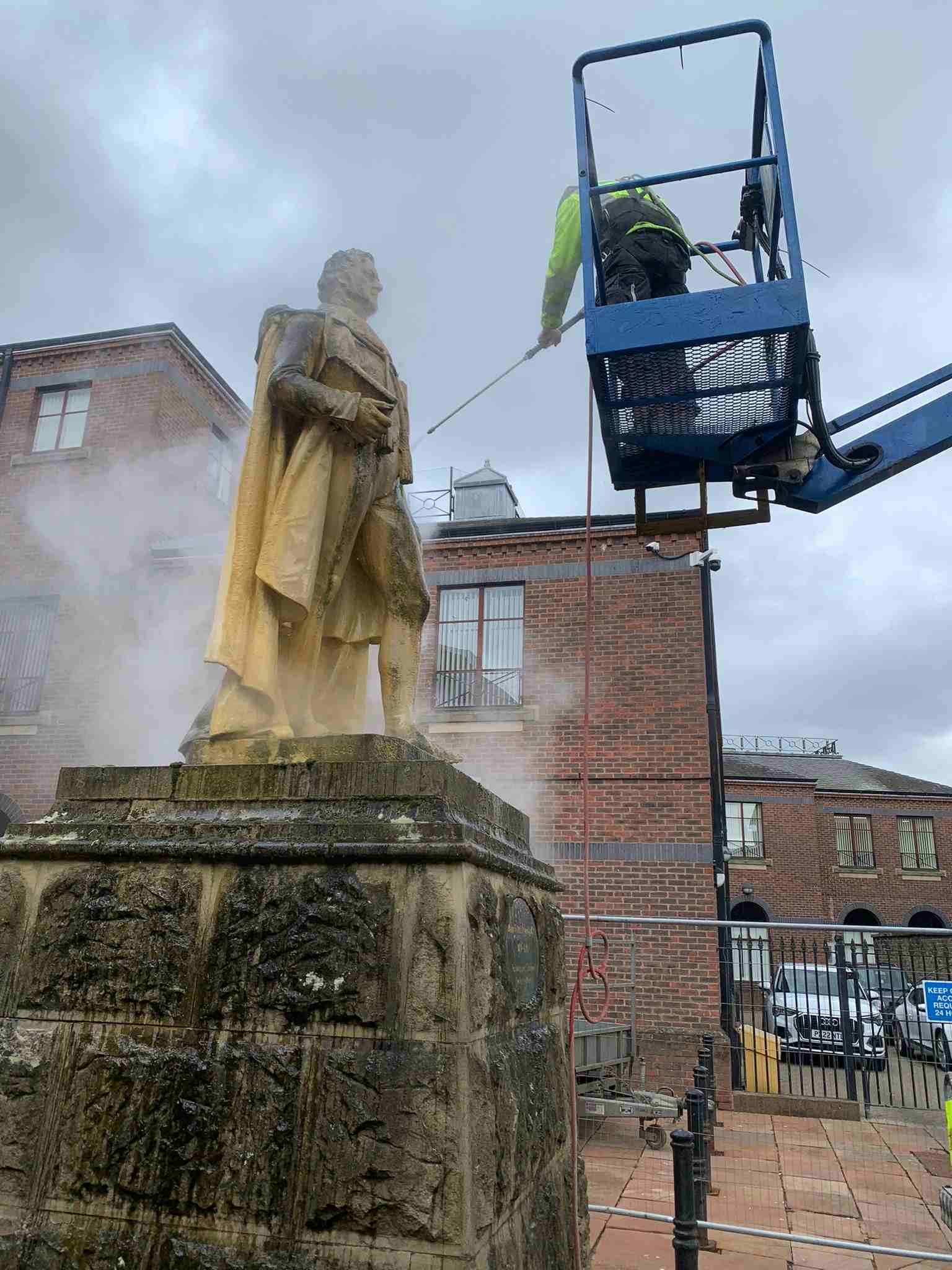 We carried out the Thermatech / DOFF cleaning to the Caen stone Grade II Listed statue of Major Francis Aglionby in Carlisle, Cumbria using our van mounted MEWP with our IPAF trained operatives. We carried out test panels on the Caen stone Grade II Listed statue and the rusticated sandstone pedestal to ascertain the correct working temperature and pressure prior to carrying out the full cleaning to ensure no damage occurred.