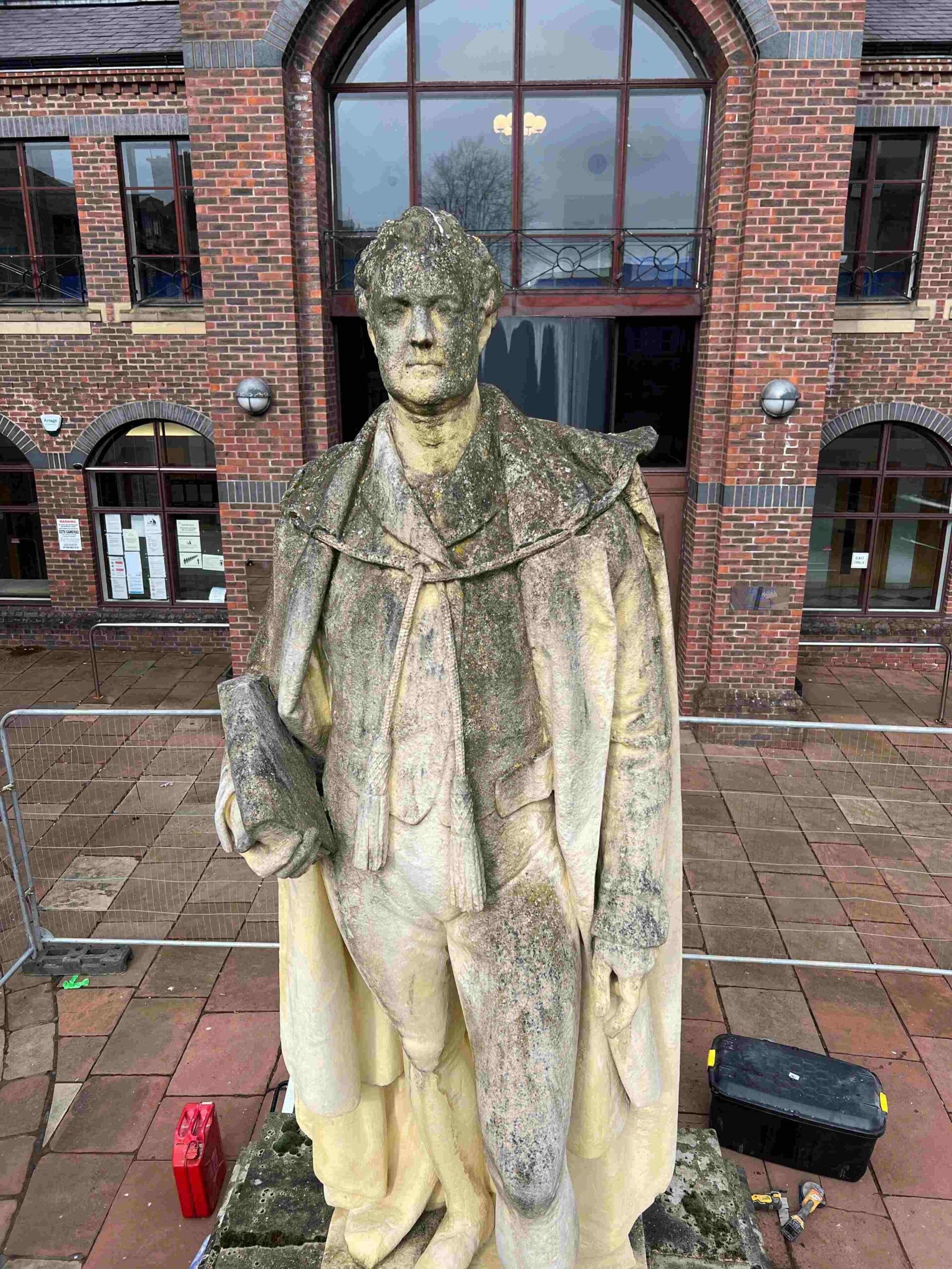 Following the completion of the Thermatech / DOFF cleaning to the Caen stone Grade II Listed statue of Major Francis Aglionby in Carlisle, Cumbria, the main contractor carried out further repairs and applied fresh coats of Limewash to ensure the statue took pride of place outside the Carlisle Combined Courts of Justice.